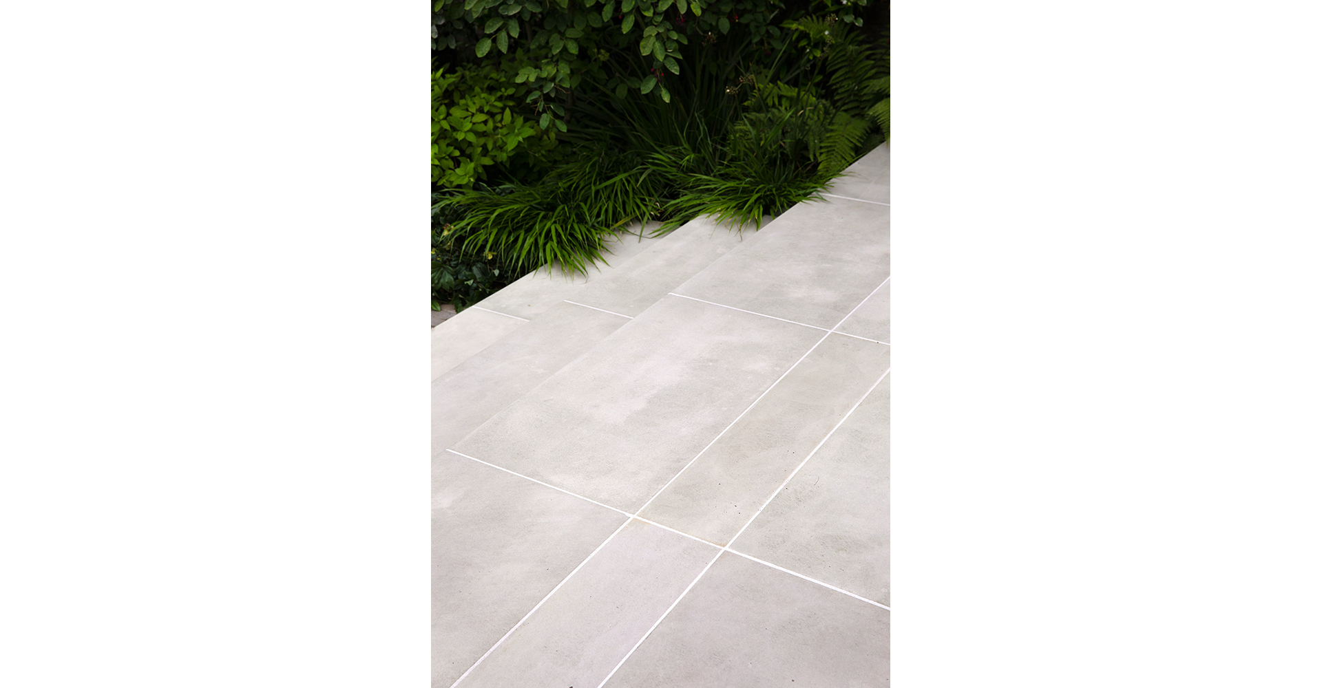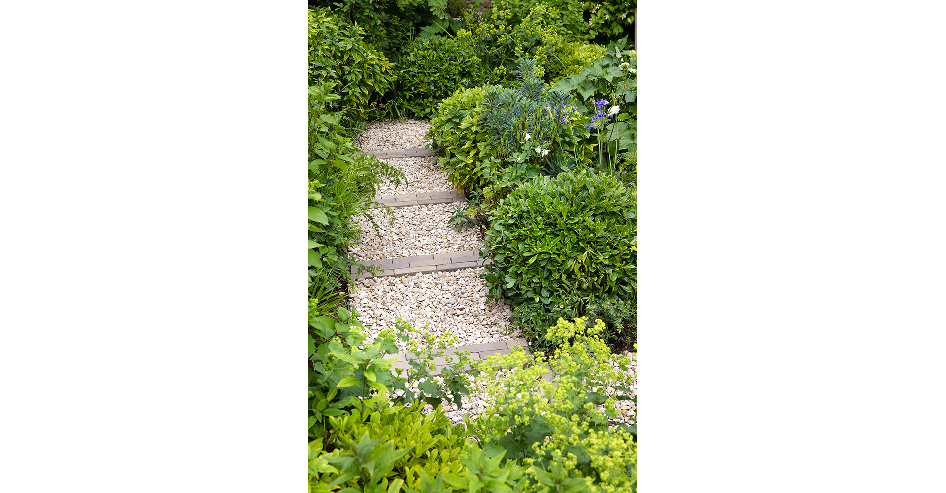 We created a terrace outside the kitchen, laid to a buff-coloured sandstone to complement the house brick. Elegant sandstone steps, with a bullnose edge, invite you down from the patio into the main garden. Here, a gravel path, interspersed with clay pavers, winds through generous planting and leads to a gravel seating area, featuring a beautiful wood-burning stove.